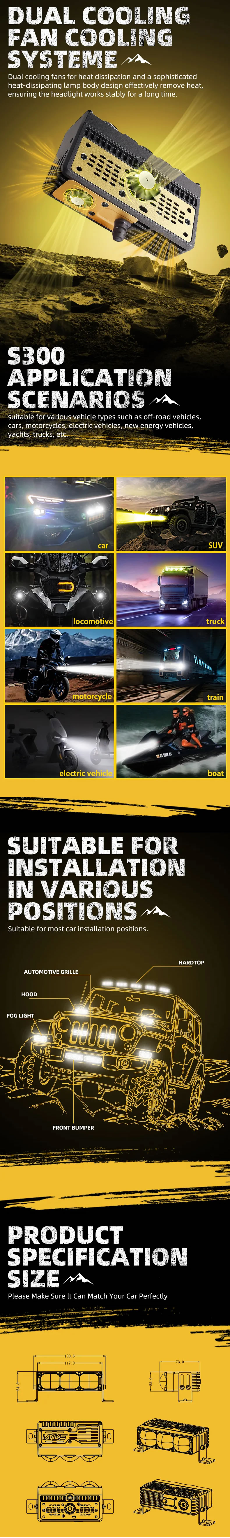 三为光学中网灯用透镜的车规光学设计在中网灯里,照路不刺眼;45度的光学角度,看得更宽,提前预知夜间行驶两侧突发事物;亮度提升了原车灯光三倍以上,看得更清更远;IP67防水不仅可以安装在中网,也可以安装在前杠、引擎盖、车顶等地方;最快安装不到10分钟,可以驾驶位无线遥控近光、远光、警示爆闪灯等!